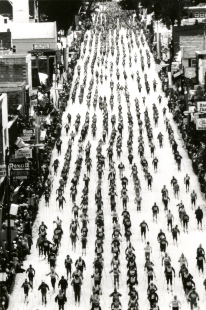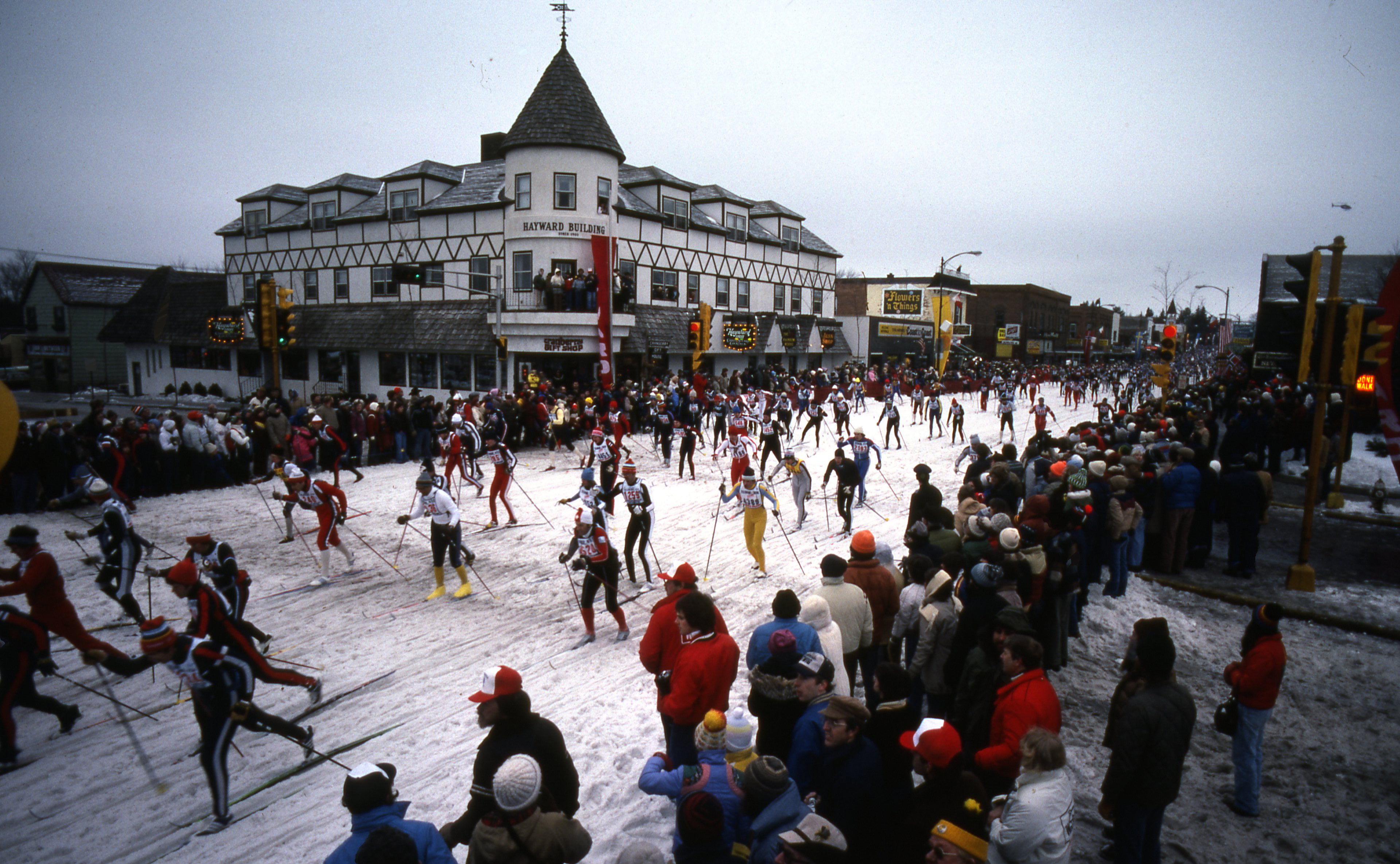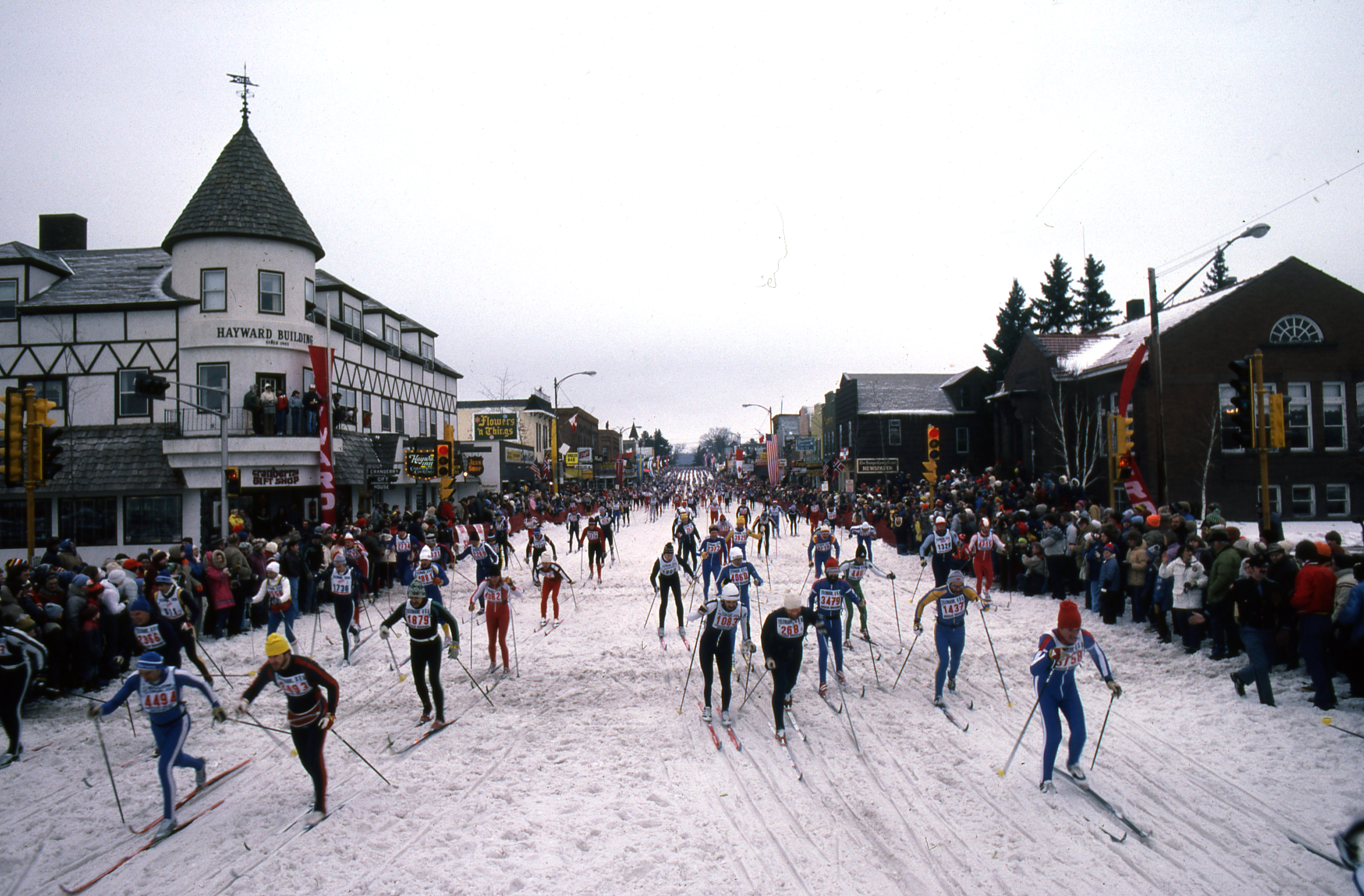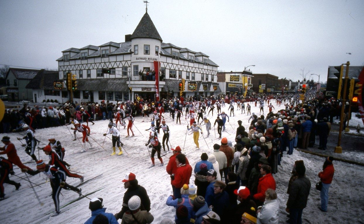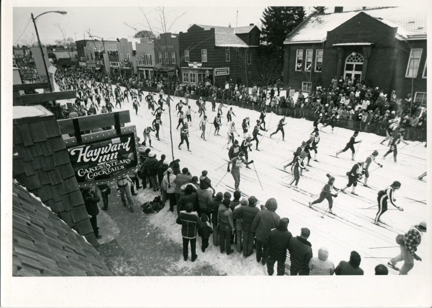 Race starts west of Hayward and skiers pass the Walker Hotel where Jackrabbit Johanssen and Tony Wise proudly watch.